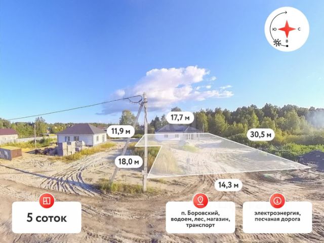 В продаже УГЛОВОЙ земельный участок ИЖС в городе Тюмени, расположенный в районе Лесобазы. Участок отсыпан. Забор с 2 сторон. Аналогов участка нет. Это единственный участок, оставшийся на Лесобазе. Земля на Лесобазе закончилась и ее больше не будет. Развитая инфраструктура: Школа, дс в 15 минутах ходьбы. Также поликлиника, перекресток, торговый центр, почта России и пункты выдачи Улица с выходом к озеру, где летом можно рыбачить, зимой ездить на лыжах, снегоходе. Красивая природа. Загородная жизнь прям в городе. Проведены свет, центральный водопровод, газ и септик. На участке уже построен дом площадью 6*6,5 в черновой отделке. Можно использовать под баню Звоните, предложение ЛИКВИД!!! Аналогов нет Номер предложения: 19117.