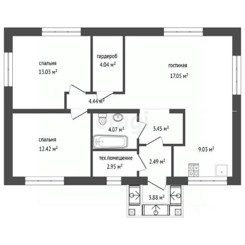 Санузел - душевое ограждение или ванна, тумба с раковиной, напольный унитаз, проложены коммуникации для стиральной машины.