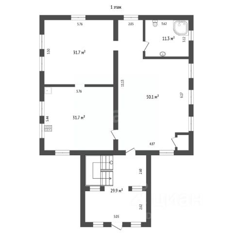 На первом этаже расположены: кухня 31.7 кв.м., гостиная 31.7 кв.м, холл 50.1 кв.м., совмещенный санузел 11.3 кв.м. на полу плитка, водяной теплый пол от газового котла, потолки натяжные комбинированные с гипсокартоном. На кухне установлен кухонный гарнитур со встраиваемой техникой. В обеденной зоне дорогостоящая итальянская мебель.