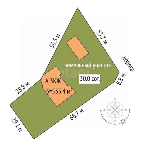 Участок правильной формы, дом находится пропорционально участку, просторная территория.