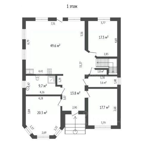 Холл с выходом на крышу веранды(балкон), комната 25кв, санузел с душевой 5кв.