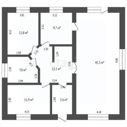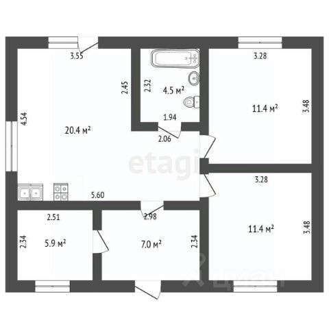 Дом площадью 60.6 кв.м с двумя комнатами и просторной 20,4м2 кухней-гостиной, где кухонная зона выделена, что обеспечивает удобство при готовке и комфортное размещение гостей.