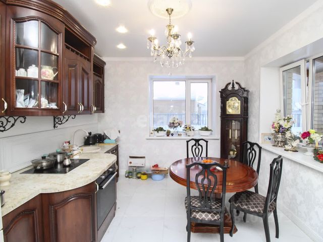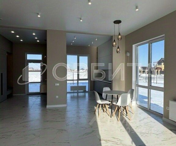 Дом с современным ремонтом: белые матовые натяжные потолки и двери придают ему стильный вид, а полы в комнатах выполнены из качественных материалов кварцвинила, ламината и керамогранита, что обеспечивает долговечность и легкость в уходе. Установлен фартук из керамогранита для будущего кухонного гарнитура. Высокие потолки объемом 3 метра создают атмосферу простора и легкости.