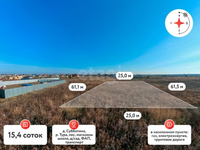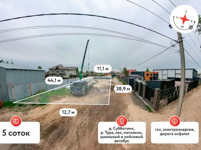 Продаётся земельный участок в окружении природы в д. Субботина по Старо-Тобольским тракту (Мальковское муниципальное образование) Населённый пункт активно развивается, большинство жителей уже пользуются своими участками для проживания и строительства домов. Характеристики участка: - Площадь: 9.7 соток - Размеры сторон: 19 м 40 м 31 м 38 м - Удобный подъезд прямо с асфальтированной дороги Коммуникации: Центральные инженерные сети подведены непосредственно к границе участка. Инфраструктура района: - Школа, детский сад, областная больница 19, Сбербанк находятся всего в 3-4 км. в селе Мальково (есть школьный автобус). - Регулярные автобусные маршруты 105, 131, 205, 305 обеспечивают удобное сообщение с городом. - По Старо Тобольскому тракту располагаются крупные супермаркеты ("Монетка", "Магнит", "Пятёрочка"), строительный магазин Строительный двор. Природные условия: - Река Тура течёт всего в 200 метрах от участка. - Отличные возможности для отдыха на природе: лесные массивы, ягодники, грибные поляны, озера поблизости. Этот вариант отлично подойдёт для индивидуального жилищного строительства (ИЖС) и позволит насладиться преимуществами загородной жизни в комфортных условиях с развитой инфраструктурой и природой вокруг! Обращайтесь за дополнительной информацией и возможностью осмотра участка. МЫ ГАРАНТИРУЕМ ФИНАНСОВУЮ БЕЗОПАСНОСТЬ ДЛЯ НАШИХ КЛИЕНТОВ. Код пользователя: 187166 Номер в базе: 9844775