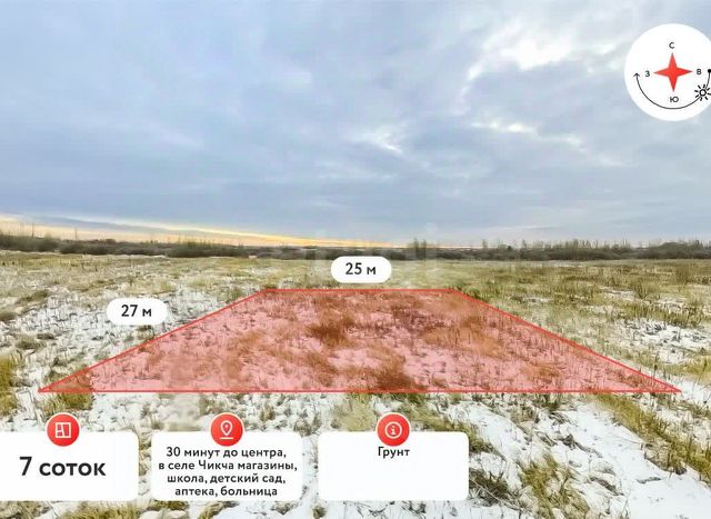 Покупай сейчас - плати потом! На данный объект доступна рассрочка на выгодных условиях Продается уникальный земельный участок площадью 7 соток в живописном районе, недалеко от коттеджного поселка Вишня. Планируется отсыпка дороги и проведения света к участку. Представьте себе, как легко вы сможете осуществить свою мечту о загородном доме, уютной бане или гараже. Этот участок — идеальное место для создания вашего идеального уголка вдали от городской суеты. Здесь вы будете наслаждаться чистым воздухом, собирать урожай с собственного огорода и проводить время на свежем воздухе, окружённом живописной природой, реками и грибными лесами. Не упустите шанс стать частью этого прекрасного места! Участок находится в непосредственной близости от села Чикча, где расположены детский сад, школа, магазины, аптека и больница — всё, что необходимо для комфортной жизни. Для любителей активного отдыха в 5 минутах езды находится база отдыха "Удача", где вы сможете наслаждаться водными процедурами и отдыхом на природе. Отличное транспортное сообщение позволит вам добраться до центра Тюмени всего за 30 минут, что делает это место идеальным для тех, кто хочет сочетать загородную жизнь с городской инфраструктурой. Не упустите свою возможность! Звоните прямо сейчас, чтобы узнать все детали и получить ответы на ваши вопросы. У нас есть выгодные условия покупки: возможна РАССРОЧКА и ИПОТЕКА с низкой процентной ставкой 6-7%. Ваш идеальный участок ждёт вас! МЫ ГАРАНТИРУЕМ ФИНАНСОВУЮ БЕЗОПАСНОСТЬ ДЛЯ НАШИХ КЛИЕНТОВ. Код пользователя: 94709 Номер в базе: 4250363