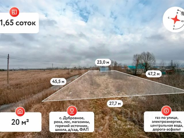 Продается новый участок 12 соток, Жилой дом, выполненный из дерева (1 этаж 20 м2), представляет собой готовое решение для сезонного проживания или может служить основой для будущего капитального строительства. До участка асфальт. Имеется электричество. По улице проходит центральный водопровод. Село Дубровное идеальное место для лесных прогулок, грибных или ягодных прогулок, охоты и рыбалки. По границе села протекает р.Тура с заливными лугами. В центре села Горячий Термальный Источник. Село уже обустроено всей необходимой инфраструктурой: продуктовые магазины, детский сад и новая школа (5-10 мин), дом культуры, спорт.площадка, ФАП (Фельдшерско-акушерский пункт) и аптека, также почтовое отделение, пункт выдачи OZON. Транспортная доступность высокая: до Тюмени ведет качественная четырехполосная магистраль с минимальной загрузкой, что делает поездки в город быстрыми и комфортными. Данный объект является выгодной инвестицией в недвижимость для постоянного проживания в экологически чистой среде или организации загородного досуга. Код пользователя: 190522 Номер в базе: 10352481