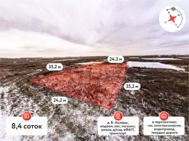 Продается участок в Больших Акиярах на Червишевском тракте 8,8 соток 23 км от объездной Данный участок представляет собой отличное предложение на рынке, оптимально сочетающее доступную цену, выгодное расположение в перспективном районе с формирующейся инфраструктурой и полной готовностью к началу строительных работ. Это перспективная инвестиция в недвижимость и возможность создать собственный дом в экологически чистом и тихом месте. Основные характеристики: • Площадь участка: 8,8 соток • Категория: земли населенных пунктов, для индивидуального жилищного строительства. Разрешено строительство жилого дома, возможна прописка • Электричество подведено к участку • Газификация территории уже в процессе • Подъезд к участку: грунт (основные дороги уже в асфальте и щебне) • Круглогодичная транспортная доступность обеспечена регулярным автобусным сообщением маршрутов 115 и 214, что делает удобными ежедневные поездки в город и обратно вне зависимости от сезона • Межевание выполнено Локация Участок отличается выгодным местоположением: он находится в непосредственной близости от деревни Большие Акияры, что гарантирует развитую инфраструктуру и статусное окружение, при этом сохраняя все преимущества уединенной и спокойной жизни. В трех километрах находится школа, детские сады, супермаркеты Звоните! С радостью расскажу подробнее и помогу подобрать лучший вариант для вашей семьи. Помощь в оформлении ипотеки. Гарантия безопасности сделки. МЫ ГАРАНТИРУЕМ ФИНАНСОВУЮ БЕЗОПАСНОСТЬ ДЛЯ НАШИХ КЛИЕНТОВ. Код пользователя: 60483 Номер в базе: 8989512