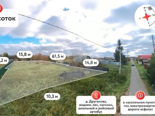 Предлагаем вашему вниманию ухоженный земельный участок площадью 19 соток в экологически чистой деревне Друганова! Преимущества: • Чистый, живописный район. • Электрифицирован и газифицирован. Инфраструктура: • Магазины. • Школьный автобус. • Асфальтированные дороги. Природа: • Смешанный лес рядом с деревней. • Река Пышма недалеко. • Небольшая речка в деревне. • Рядом база отдыха Жемчужина Сибири. Поистине замечательные виды Перспективы: • Идеально подходит для строительства коттеджа или дома для большой семьи, для загородного отдыха. Не упустите возможность построить свой дом мечты в экологически чистом месте! Преимущество: •Полное юридическое сопровождение и безопасность сделки от компании Этажи. •Помощь в одобрении ипотеки. •Онлайн проведение сделки. Показ в любое удобное для вас время! МЫ ГАРАНТИРУЕМ ФИНАНСОВУЮ БЕЗОПАСНОСТЬ ДЛЯ НАШИХ КЛИЕНТОВ. Код пользователя: 59457 Номер в базе: 9032295