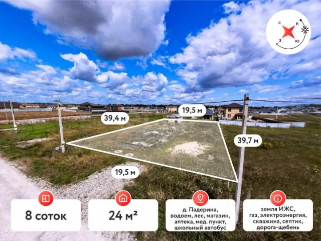 Предлагаем шикарный земельный участок в деревне ПАДЕРИНА по Московскому тракту! Участок 8 соток правильной прямоугольной формы имеет удачное расположение! д.Падерина - одна из самых выгодных и перспективных локаций, граничащая с городом. Удобная транспортная развязка, близость к городу. Территория подлежит комплексному освоению: запланировано строительство детского сада, школы, спортивных и детских площадок, дороги (соединяющей д. Падерина с городом), а так же строительство централизованного водоснабжения и канализации, асфальтирование дорог и тротуаров. Идеальный вариант, как для строительства дома (семейная ипотека 6%), так и для инвестиционных вложений. КОММУНИКАЦИИ: Стояк для газа выведен к участку. Электрический столб возле участка. Категория земель: земли населенных пунктов, вид разрешенного использования: ИЖС. Один собственник. Обременения отсутствуют. Звоните. Организуем показ в удобное для Вас время! Помощь в оформлении ипотеки. Гарантия безопасности сделки! МЫ ГАРАНТИРУЕМ ФИНАНСОВУЮ БЕЗОПАСНОСТЬ ДЛЯ НАШИХ КЛИЕНТОВ. Код пользователя: 26890 Номер в базе: 1721748