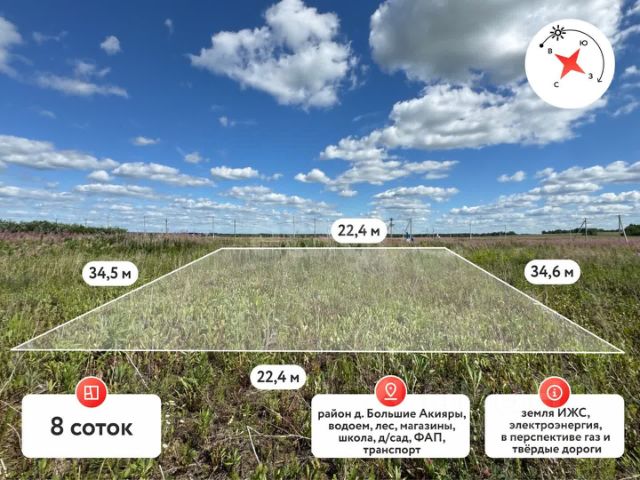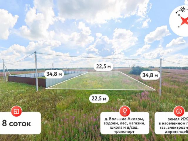 Ваша мечта о собственном доме начинается здесь! Земельный участок ИЖС 8 соток в Больших Акиярах! Представляем вашему вниманию идеальный участок для строительства дома вашей мечты в живописном и спокойном месте — Больших Акиярах! Если вы давно мечтали о загородной жизни с городским комфортом, этот вариант для вас! Преимущества нашего предложения: ИЖС 8 соток: Достаточно места для просторного дома, уютного сада, зоны барбекю и всего, что вы захотите! Разрешенное индивидуальное жилищное строительство — стройте без ограничений! Правильная форма: Участок имеет идеальную прямоугольную или квадратную форму, что значительно упрощает планировку и строительство вашего будущего дома и ландшафтный дизайн. Все коммуникации уже есть: Электричество — легко подключайтесь и начинайте строительство! Газ — обеспечит тепло и комфорт в вашем доме круглый год. Дороги — удобные подъездные пути до самого участка, никаких проблем с доступом в любую погоду. Отличное месторасположение: Большие Акияры — это тишина, природа и свежий воздух, при этом недалеко от города, что позволяет совмещать загородный образ жизни с работой и учебой. Не упустите уникальный шанс воплотить свою мечту о собственном доме! Это идеальное место для жизни и отдыха всей семьи. Звоните прямо сейчас, чтобы узнать подробности и договориться о просмотре! Номер предложения: 33436.