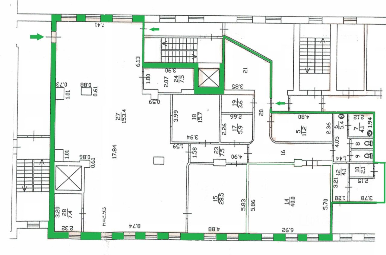 Три входных группы, высота потолков 3 м.;