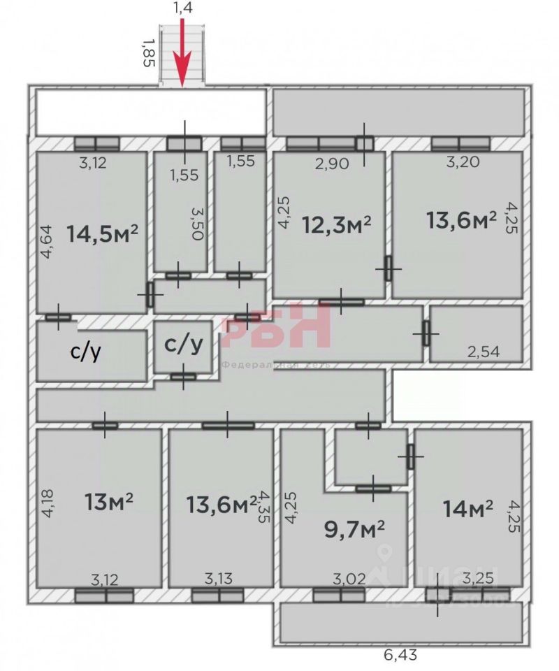кабинетная планировка, 7 кабинетов, подсобные помещения, 2 с/у.