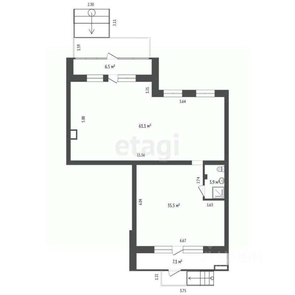 - Помещение разделено на 2 зала (61 м2 и 35 м2);