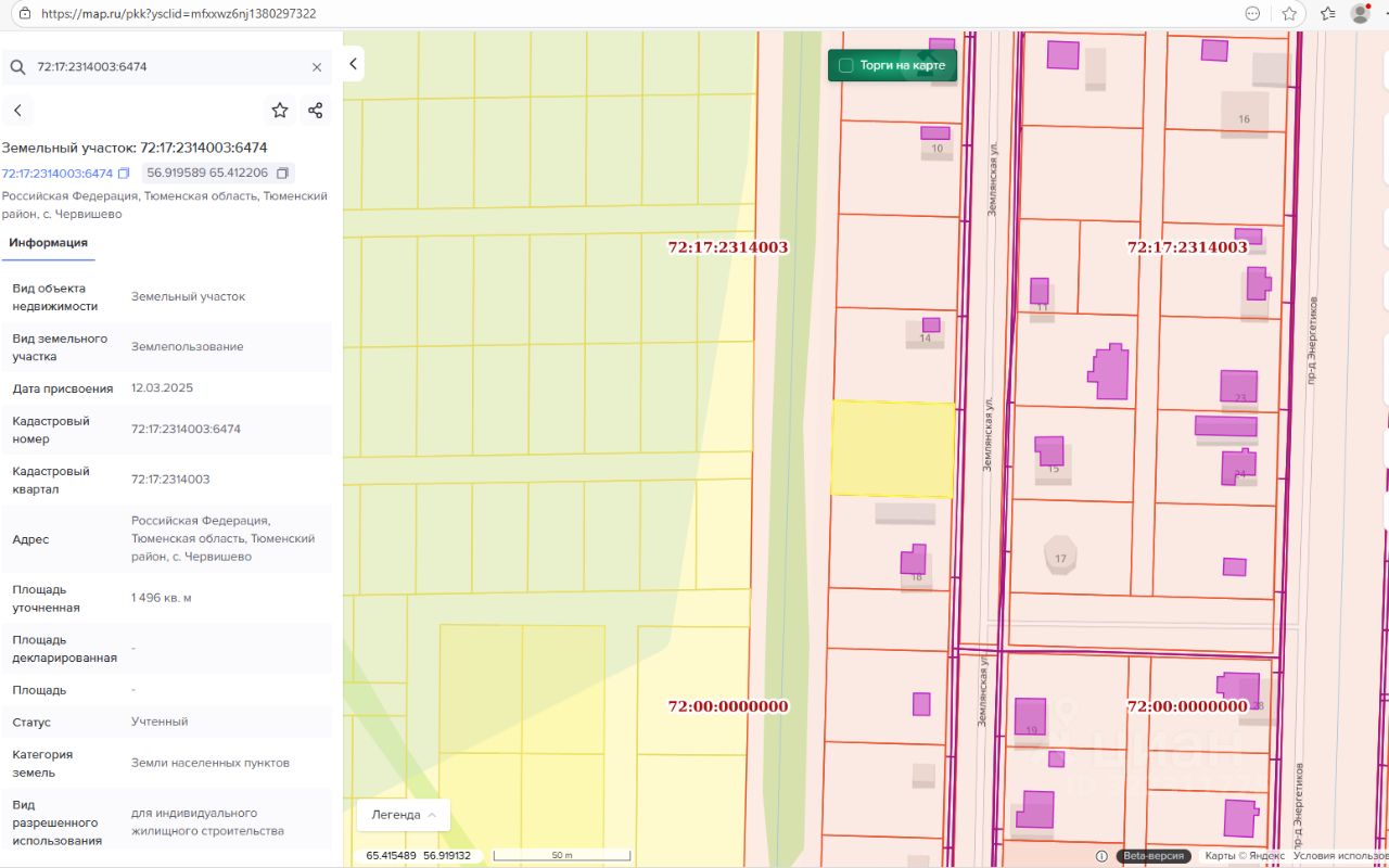 - адрес (местоположение) Российская Федерация, Тюменская область, Тюменский район, с. Червишево; - кадастровый номер 72:17:2314003:6474; - площадь 1 496 кв.м; - разрешенное использование для индивидуального жилищного строительства; - категория земель земли населенных пунктов; - территориальная зона зона застройки индивидуальными жилыми домами (Ж1);