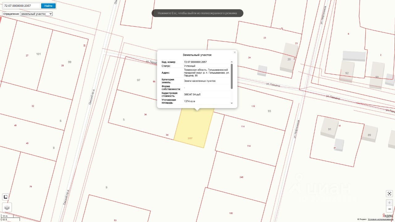 земельный участок, расположенный по адресу: Тюменская область, Голышмановский городской округ, р.п. Голышманово, ул. Герцена, 95, кадастровый номер 72:07:0000000:2057