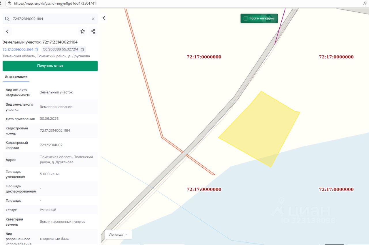 - адрес (местоположение) Тюменская область, Тюменский район, д. Друганова; - кадастровый номер 72:17:2314002:1164; - площадь 5000 кв.м; - разрешенное использование спортивные базы; - категория земель земли населенных пунктов; - территориальная зона зона рекреационного назначения (Р).