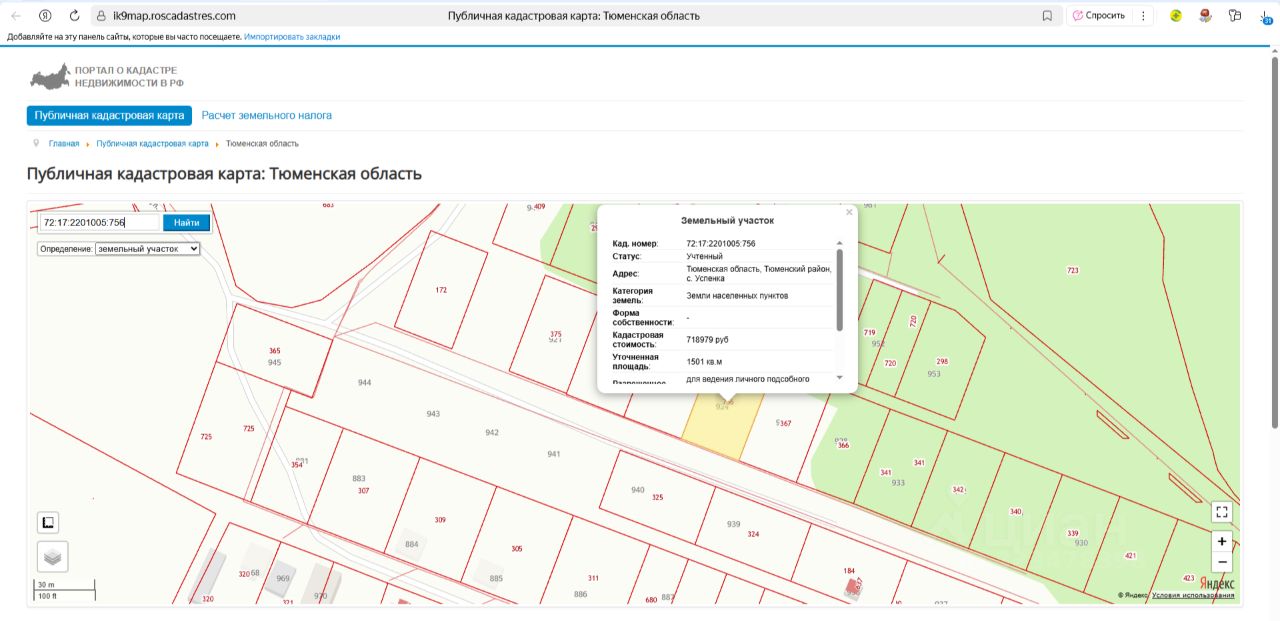 адрес (местоположение) Тюменская область, Тюменский район, с. Успенка; - кадастровый номер 72:17:2201005:756; - площадь 1501 кв.м; - разрешенное использование для ведения личного подсобного хозяйства (приусадебный земельный участок); - категория земель земли населенных пунктов; - территориальная зона зона застройки индивидуальными жилыми домами (Ж1).