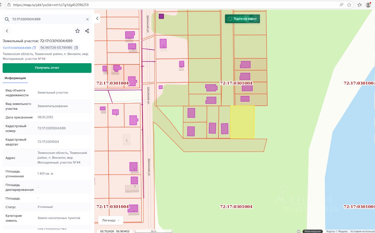 - адрес (местоположение)  Тюменская область, Тюменский район, п. Винзили,      мкр. Молодежный, участок 44; - кадастровый номер  72:17:0301004:699; - площадь  1 401 кв.м; - разрешенное использование  для строительства индивидуального жилого дома и хозяйственно-бытовых строений; - категория земель  земли населенных пунктов; - территориальная зона  зона застройки индивидуальными жилыми домами (Ж1)