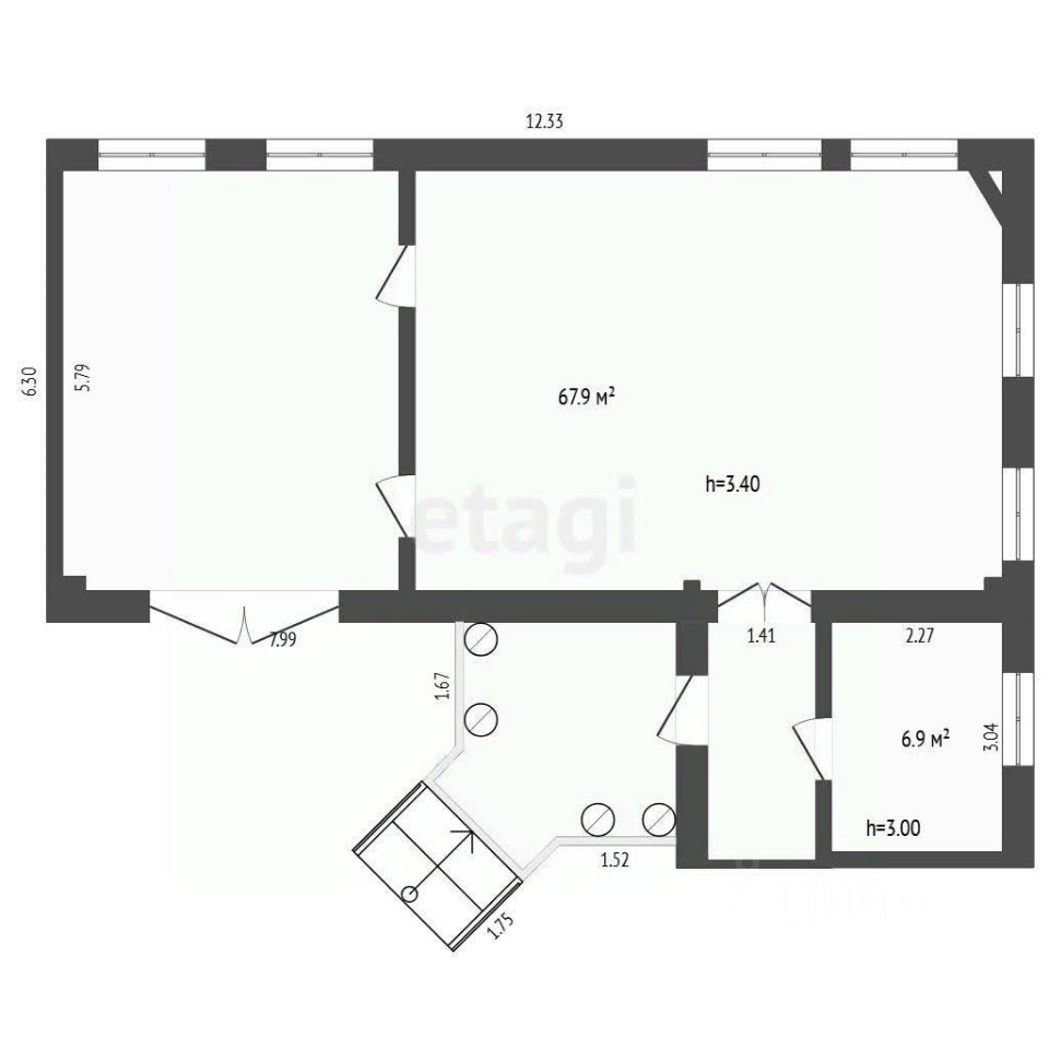 Помещение состоит из: большого зала (офис или торговая площадь) + площадь для хранения (склад) со своими воротами для удобной погрузки/разгрузки и санузла.
