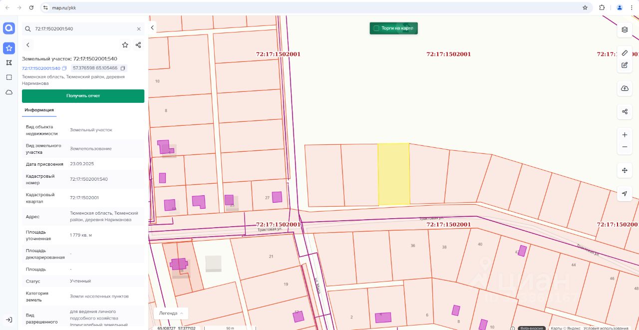 адрес (местоположение) Тюменская область, Тюменский район, деревня Нариманова; - кадастровый номер 72:17:1502001:540; - площадь 1 779 кв.м; - разрешенное использование для ведения личного подсобного хозяйства (приусадебный земельный участок); - категория земель земли населенных пунктов; - территориальная зона зона застройки индивидуальными жилыми домами (Ж1).