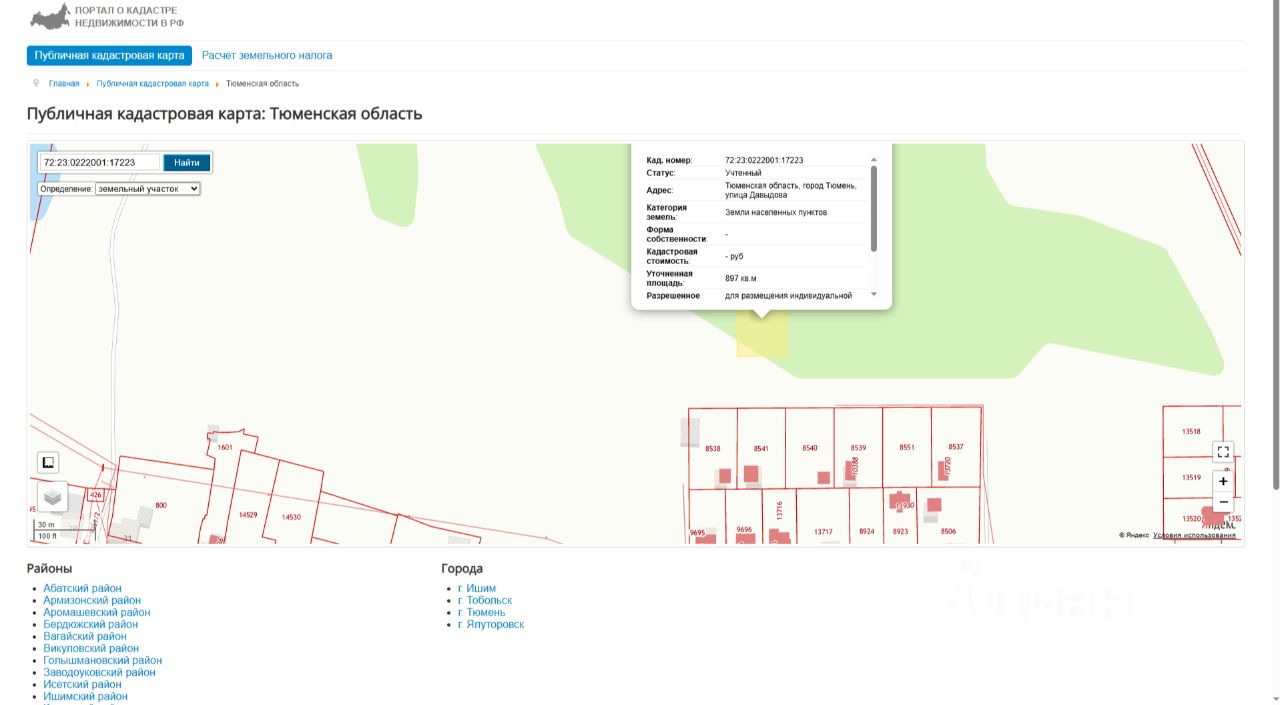 адрес (местоположение) Тюменская область, город Тюмень, улица Давыдова; - кадастровый номер 72:23:0222001:17223; - площадь 897 кв.м; - разрешенное использование для размещения индивидуальной жилой застройки; - категория земель земли населенных пунктов; - территориальная зона подзона застройки индивидуальными жилыми домами (Ж-3.1).