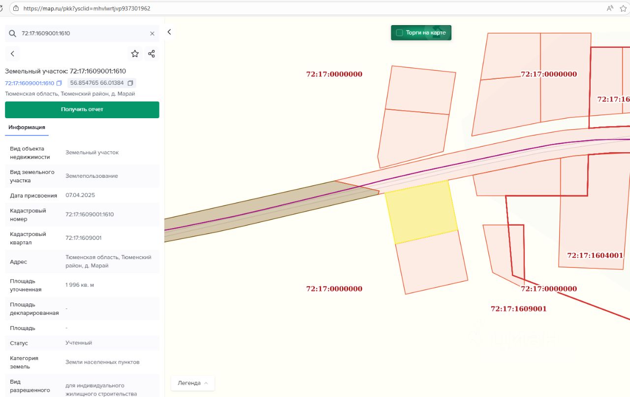 - адрес (местоположение) Тюменская область, Тюменский район, д. Марай; - кадастровый номер 72:17:1609001:1610; - площадь 1 996 кв.м; - разрешенное использование для индивидуального жилищного строительства; - категория земель земли населенных пунктов; - территориальная зона зона застройки индивидуальными жилыми домами (Ж1)