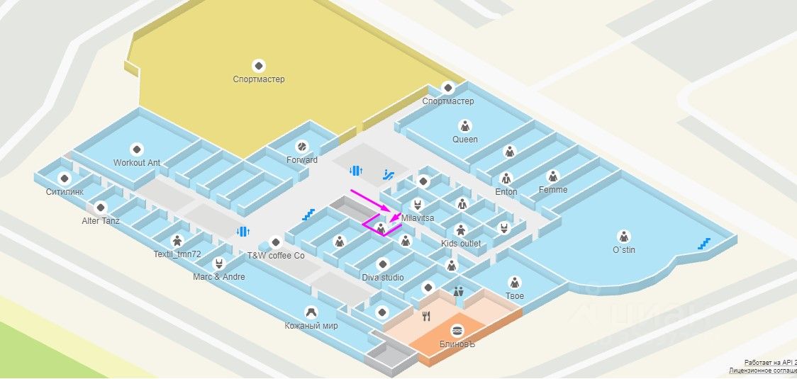Помещение расположено на 2-м этаже на основном проходе, непосредственно возле эскалатора и якорных арендаторов. Площадь помещения 19.9 кв.м.
