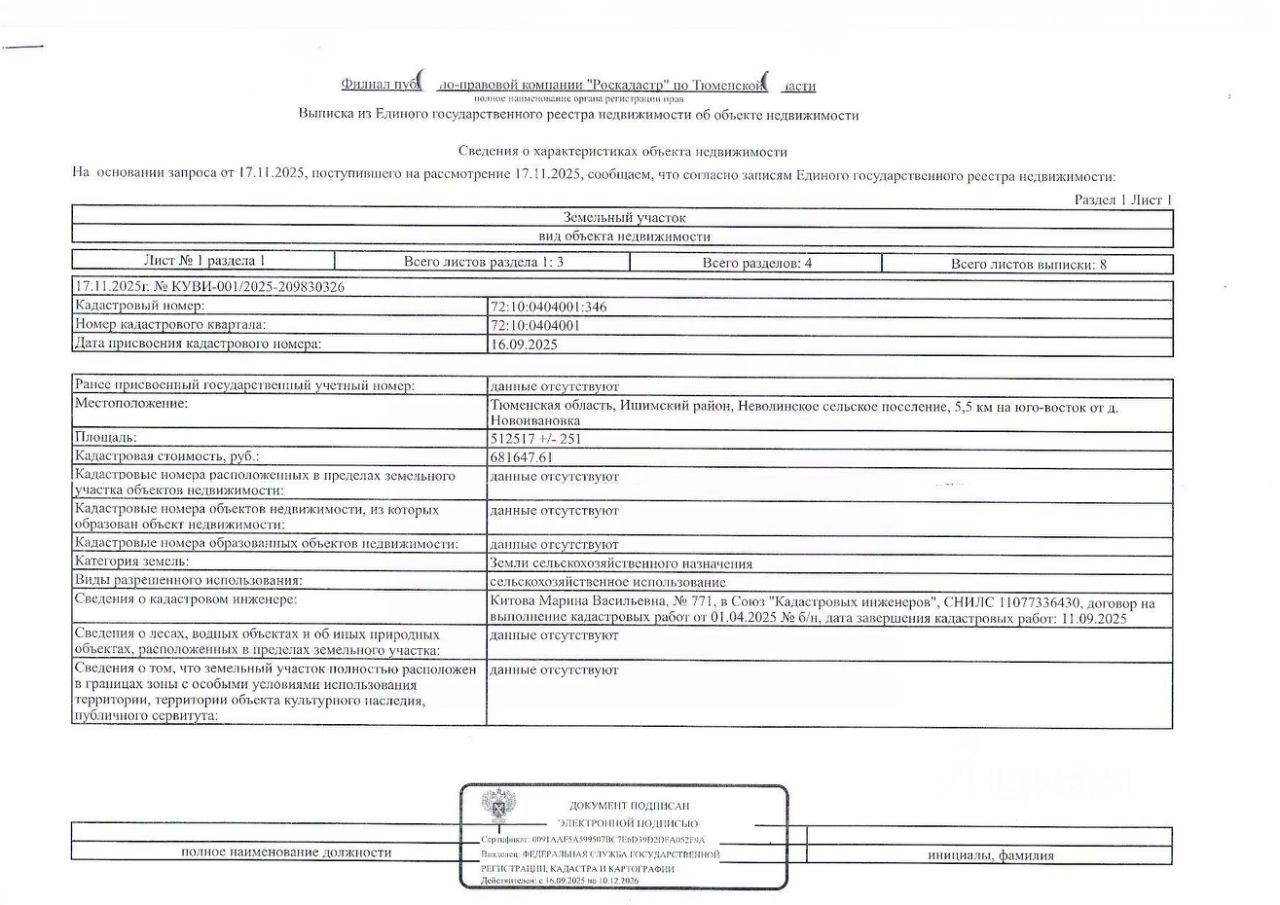 Земельный участок, расположенный по адресу: Тюменская область, Ишимский район, Неволинское сельское поселение, 5,5 км на юго-восток от д. Новоивановка; площадь земельного участка 512517 кв. м; кадастровый номер: 72:10:0404001:346; категория земель земли сельскохозяйственного назначения; вид разрешенного использования земельного участка сельскохозяйственное использование.