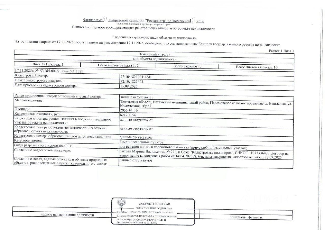 Земельный участок, расположенный по адресу: Тюменская область, Ишимский муниципальный район, Пахомовское сельское поселение, д. Ваньковка, ул. Молодежная, з/у 41; площадь земельного участка 2056 кв. м; кадастровый номер: 72:10:1821001:1641; категория земель земли населенных пунктов; вид разрешенного использования земельного участка для ведения личного подсобного хозяйства (приусадебный земельный участок).