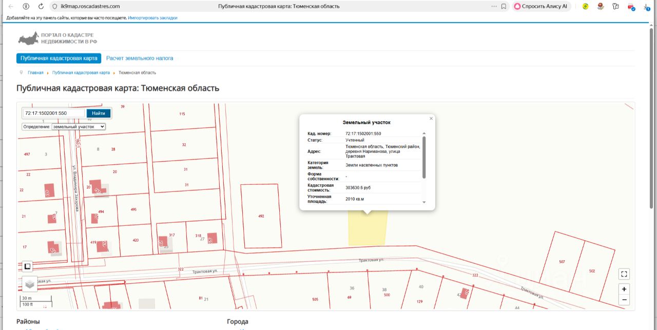 - адрес (местоположение) Тюменская область, Тюменский район, деревня Нариманова, улица Трактовая; - кадастровый номер 72:17:1502001:550; - площадь 2 010кв.м; - разрешенное использование для индивидуального жилищного строительства; - категория земель земли населенных пунктов; - территориальная зона зона застройки индивидуальными жилыми домами (Ж1).