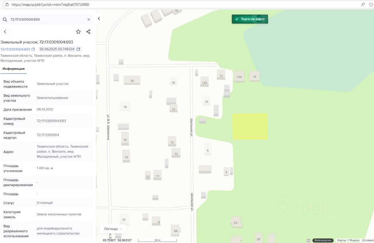 - адрес (местоположение) Тюменская область, Тюменский район, п. Винзили, мкр. Молодежный, участок 51; - кадастровый номер 72:17:0301004:693; - площадь 1 401 кв.м; - разрешенное использование для индивидуального жилищного строительства; - категория земель земли населенных пунктов; - территориальная зона зона застройки индивидуальными жилыми домами (Ж1)