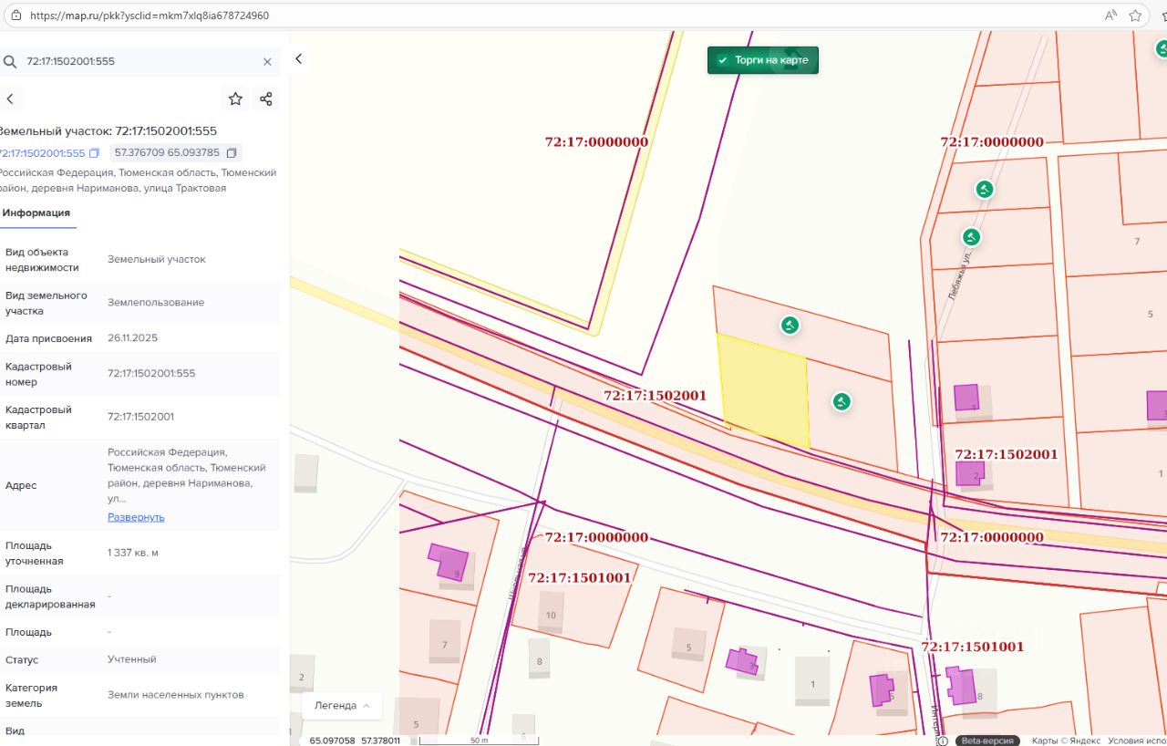 - адрес (местоположение) Российская Федерация, Тюменская область, Тюменский район, деревня Нариманова, улица Трактовая; - кадастровый номер 72:17:1502001:555; - площадь 1 337 кв.м; - разрешенное использование для индивидуального жилищного строительства; - категория земель земли населенных пунктов; - территориальная зона зона застройки индивидуальными жилыми домами (Ж1)