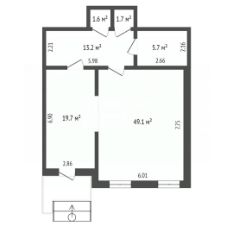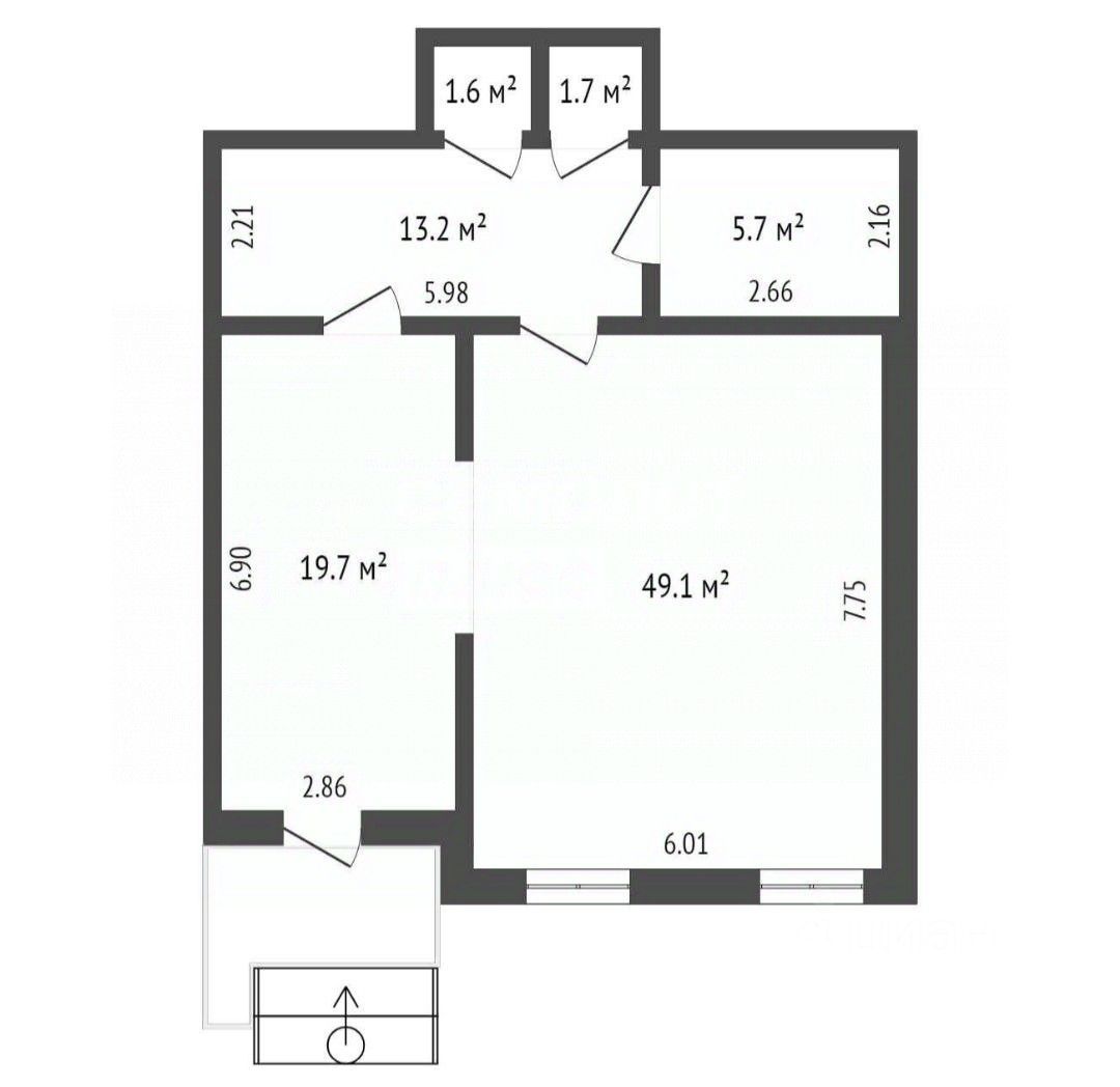 Планировка - входная зона, зал 49 кв.м, подсобное помещение, санузел.