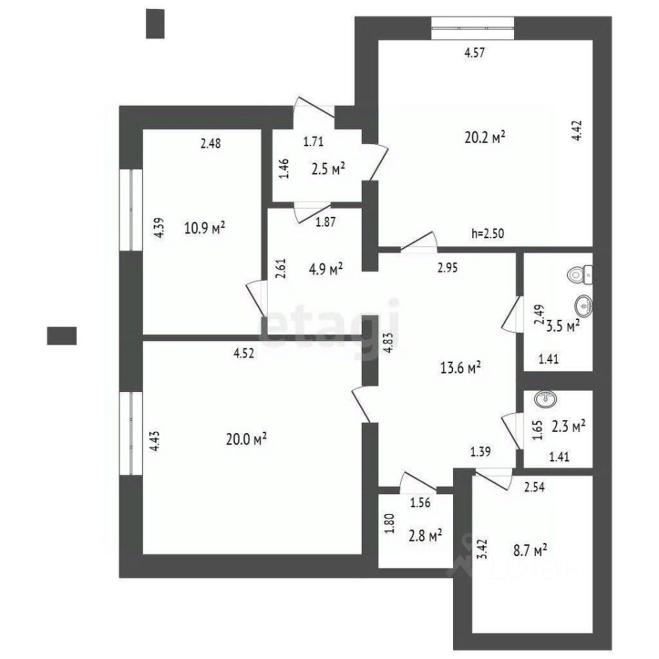 - Высота потолка: 2,5м;