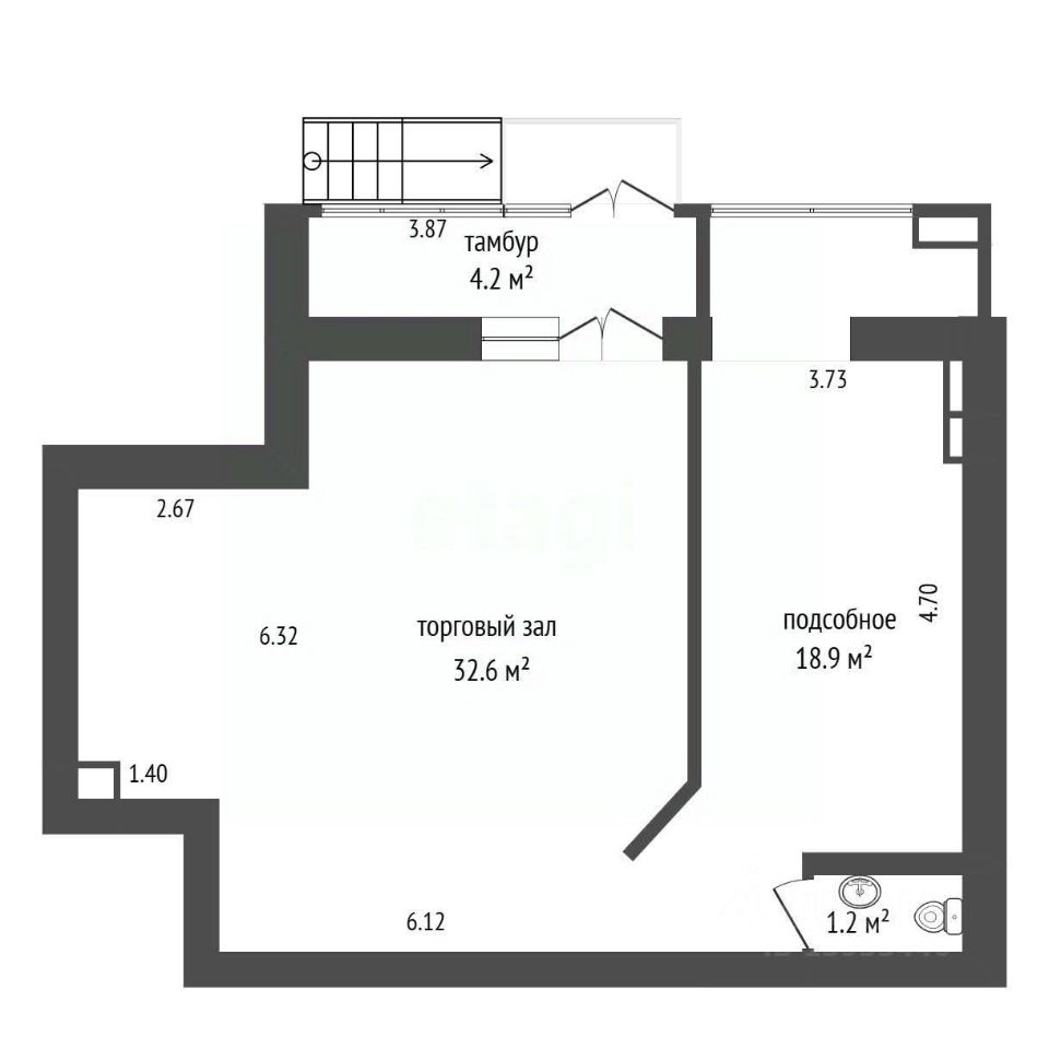Планировка представляет собой торговый зал 32,6 кв.м. + подсобное помещение 18,9 кв.м. и тамбур 4,2 кв.м.