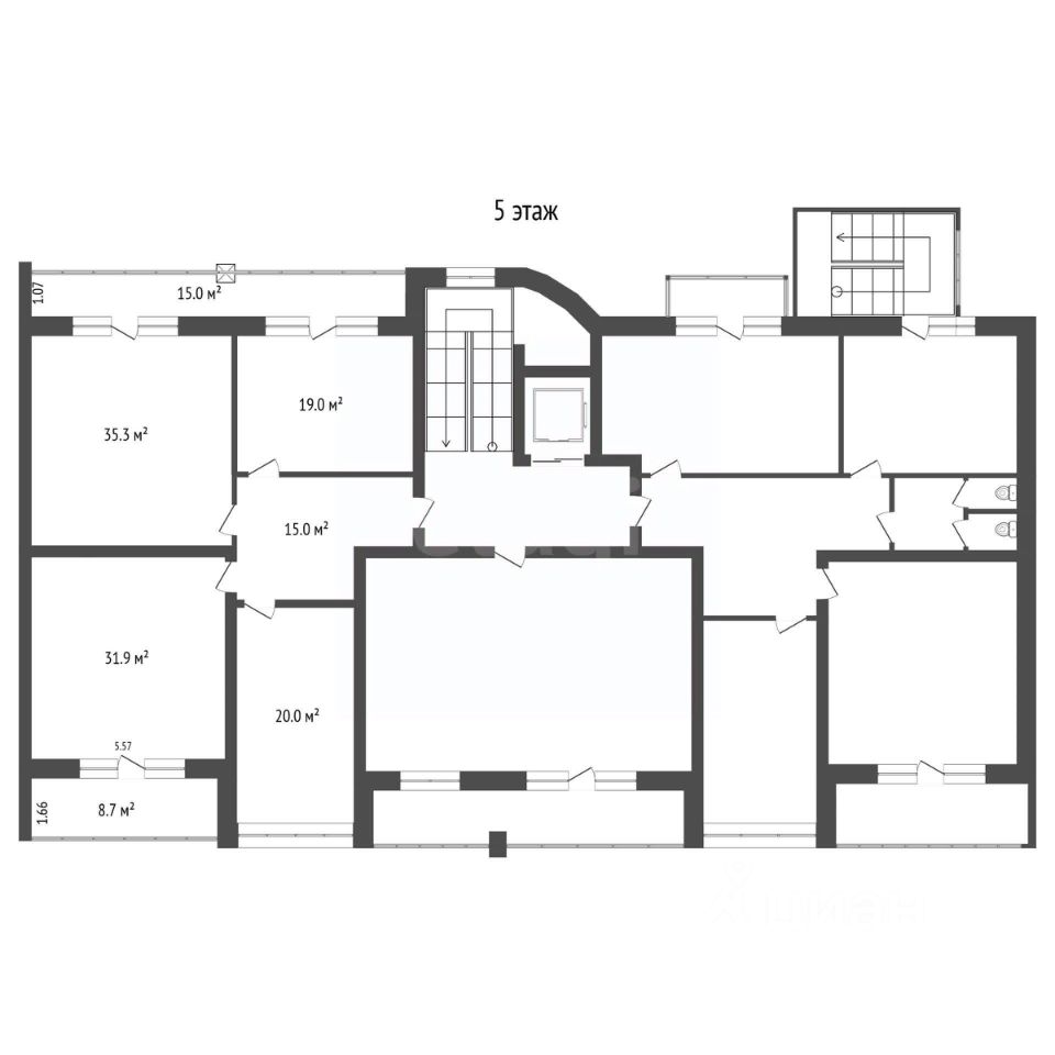 Офисное помещение состоит из 4-х кабинетов: 35м2, 32м2, 20м2, и 19м2, коридора: 15м2, 2-х балконов 9м2 и 15м2.