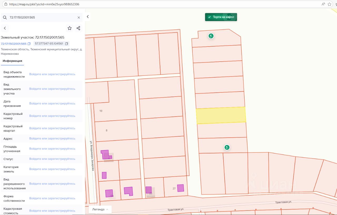 - адрес (местоположение) Тюменская область, Тюменский муниципальный округ, д. Нариманова; - кадастровый номер 72:17:1502001:565; - площадь 1 558 кв.м; - разрешенное использование для индивидуального жилищного строительства; - категория земель земли населенных пунктов; - территориальная зона зона застройки индивидуальными жилыми домами (Ж1)