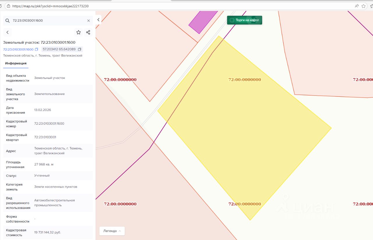 - адрес (местоположение) Тюменская область, г. Тюмень, тракт Велижанский; - кадастровый номер 72:23:0103001:1600; - площадь 27 968 кв.м; - вид разрешенного использования автомобилестроительная промышленность; - категория земель земли населенных пунктов; - территориальная зона зона размещения производственных объектов с санитарно-защитной зоной не более 100 метров (П-1);