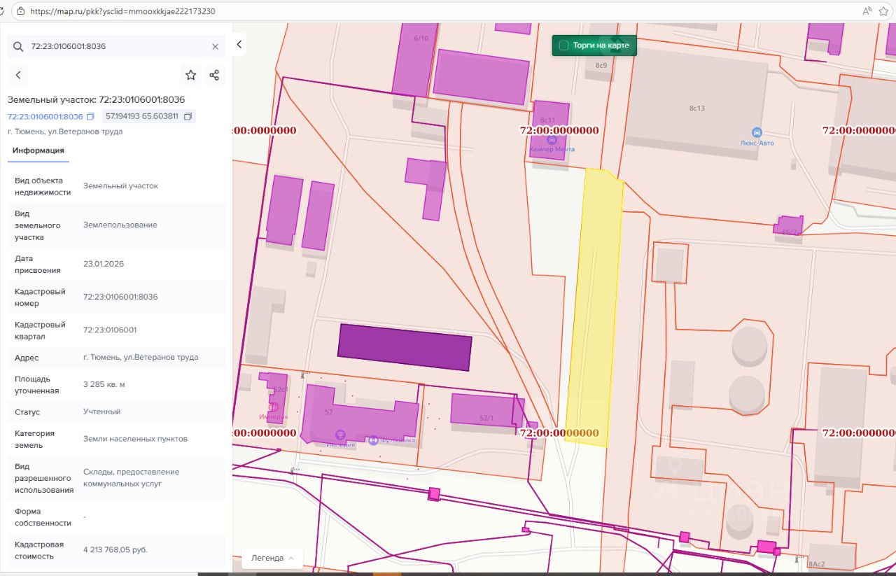 - адрес (местоположение) г. Тюмень, ул.Ветеранов труда; - кадастровый номер 72:23:0106001:8036; - площадь 3 285 кв.м; - виды разрешенного использования Склады, предоставление коммунальных услуг; - категория земель земли населенных пунктов; - территориальная зона зона размещения производственных объектов с санитарно-защитной зоной не более 100 метров (П-1);