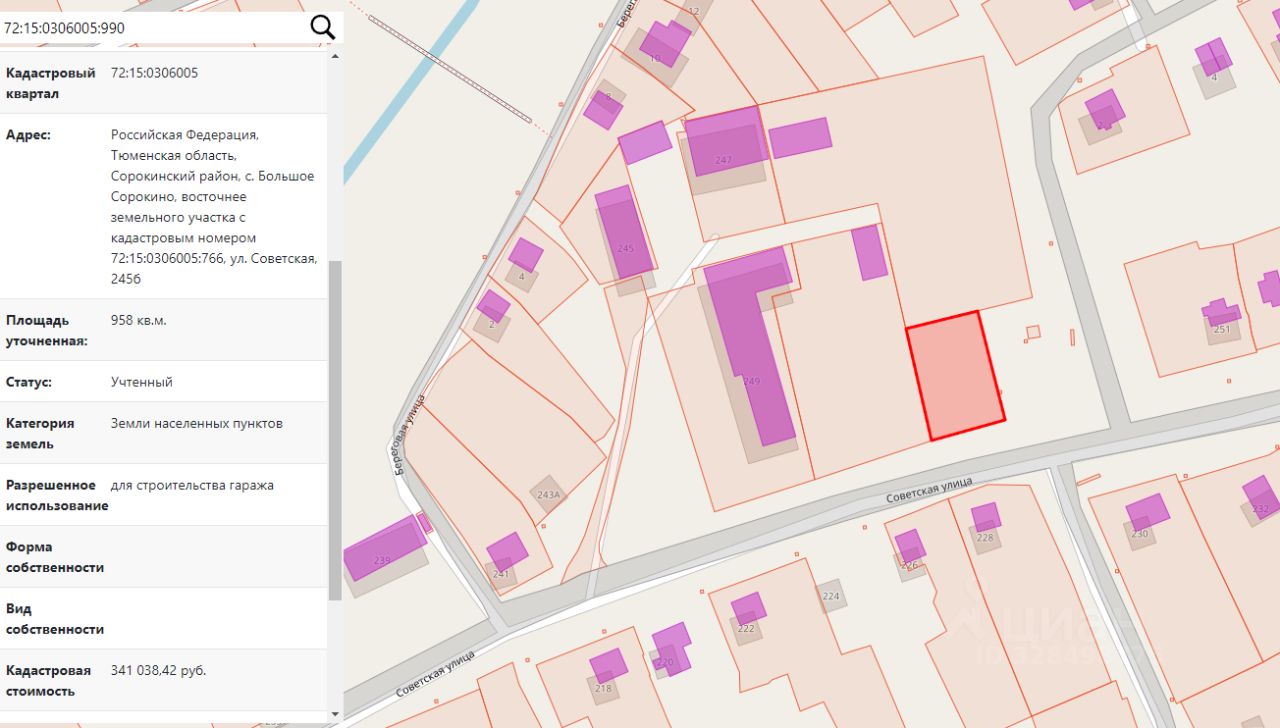 Кадастровый номер земельного участка: 72:15:0306005:990 Местоположение земельного участка: Тюменская область, Сорокинский район, с. Большое Сорокино, восточнее земельного участка с кадастровым номером 72:15:0306005:766, ул. Советская, 245б. Площадь земельного участка: 958 кв.м. Право на земельный участок: земельный участок, государственная собственность на который не разграничена. Разрешенное использование земельного участка: для строительства гаража. Категория земель: земли населенных пунктов.