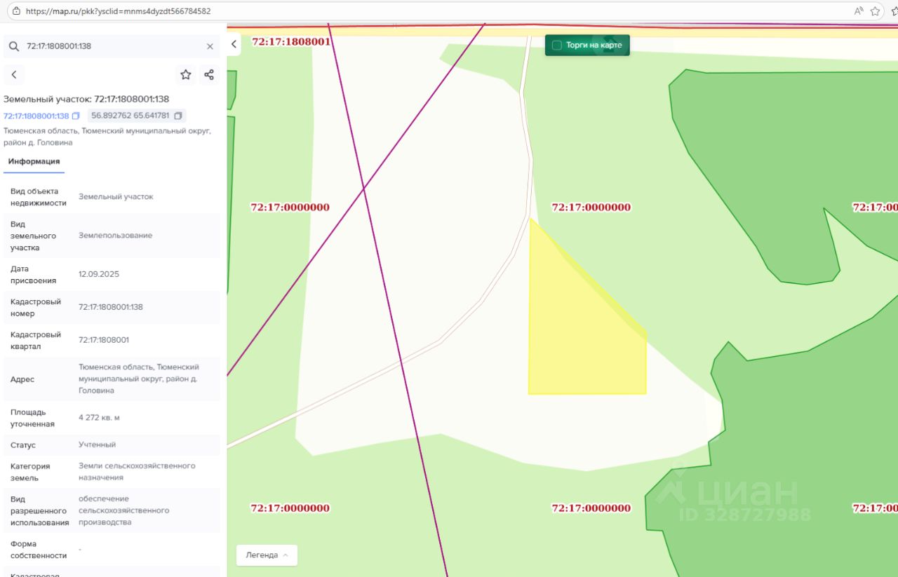 - адрес (местоположение) Тюменская область, Тюменский муниципальный округ, район д. Головина; - кадастровый номер 72:17:1808001:138; - площадь 4 272 кв.м; - вид разрешенного использования обеспечение сельскохозяйственного производства; - категория земель земли сельскохозяйственного назначения; - территориальная зона зона, занятая объектами сельскохозяйственного назначения (Сх2)
