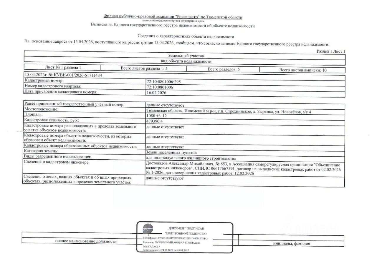 Земельный участок, расположенный по адресу: Тюменская область, Ишимский муниципальный район, сельское поселение Стрехнинское, д. Зырянка, ул. Новоселов, з/у 4; площадь земельного участка 1080 кв. м; кадастровый номер: 72:10:0801006:295; категория земель земли населенных пунктов; вид разрешенного использования земельного участка для индивидуального жилищного строительства.