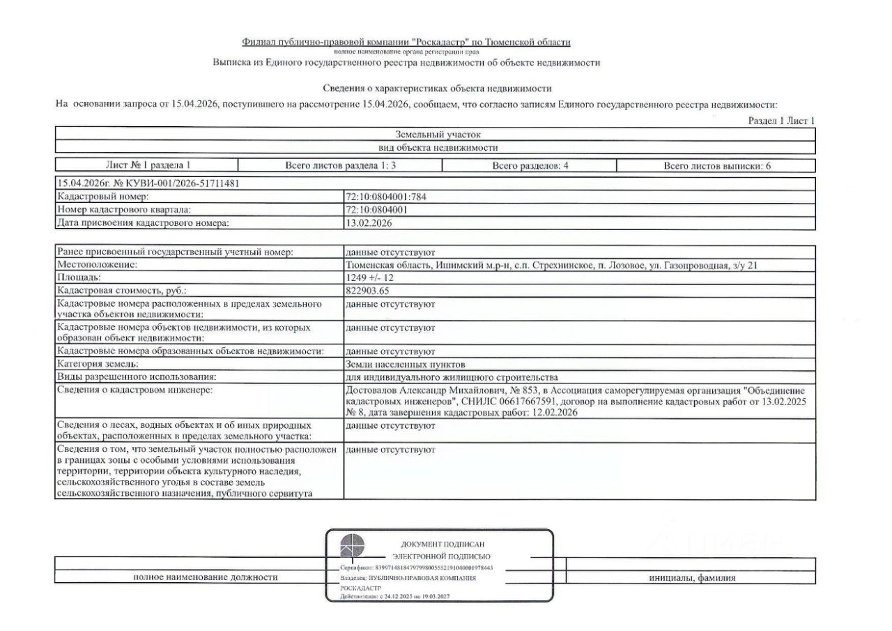 Земельный участок, расположенный по адресу: Тюменская область, Ишимский муниципальный район, сельское поселение Стрехнинское, п. Лозовое, ул. Газопроводная, з/у 21; площадь земельного участка 1249 кв. м; кадастровый номер: 72:10:0804001:784; категория земель земли населенных пунктов; вид разрешенного использования земельного участка для индивидуального жилищного строительства.
