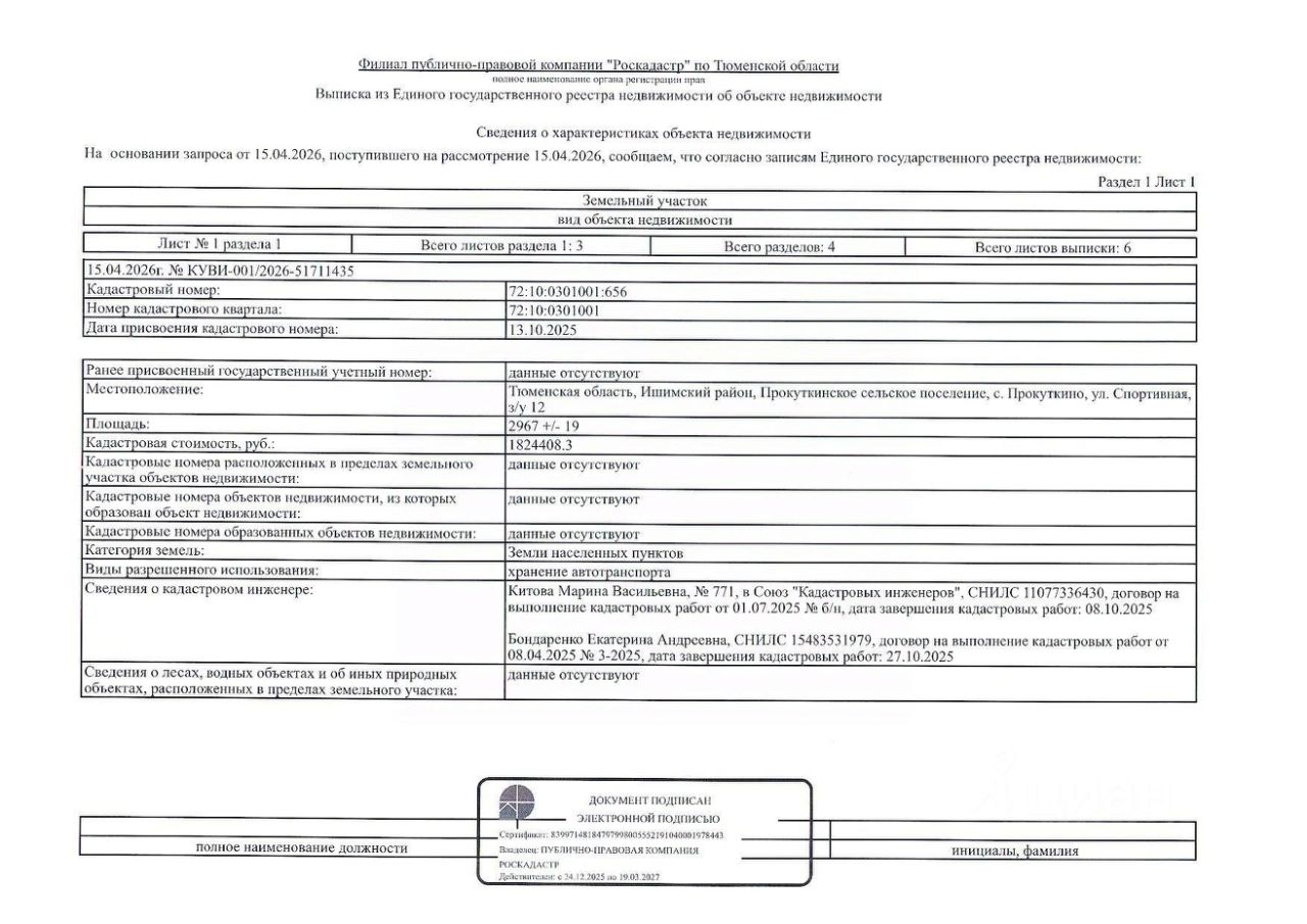 Земельный участок, расположенный по адресу: Тюменская область, Ишимский район, Прокуткинское сельское поселение, с. Прокуткино, ул. Спортивная, з/у 12; площадь земельного участка 2967 кв. м; кадастровый номер: 72:10:0301001:656; категория земель земли населенных пунктов; вид разрешенного использования земельного участка хранение автотранспорта.