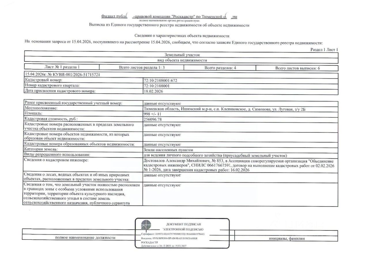 Земельный участок, расположенный по адресу: Тюменская область, Ишимский муниципальный район, сельское поселение Клепиковское, д. Симонова, ул. Луговая, з/у 2Б; площадь земельного участка 998 кв. м; кадастровый номер: 72:10:2108001:672; категория земель земли населенных пунктов; вид разрешенного использования земельного участка для ведения личного подсобного хозяйства (приусадебный земельный участок).