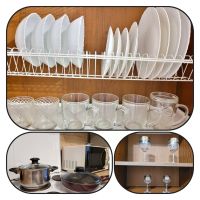 - На кухне имеется вся необходимая посуда для приготовления и принятия пищи; СВЧ-печь, эл.плита с духовкой, холодильник, электрочайник.