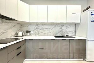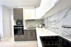 Современная бытовая техника: варочная панель, духовой шкаф, двухкамерный холодильник, электрочайник, СВЧ, фен, утюг, стиральная и посудомоечная машина.