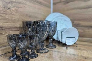 Полностью оборудованная кухня посуда, плита, микроволновая печь, чайник.