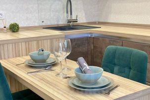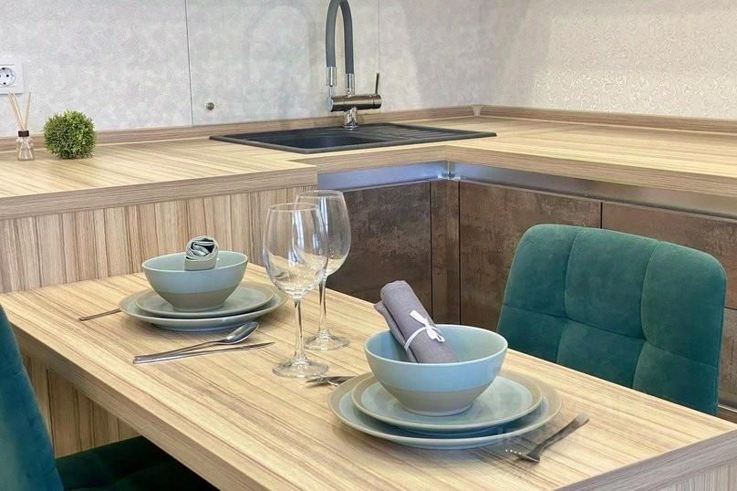 Полностью оборудованная кухня плита, микроволновая печь, чайник, посуда.