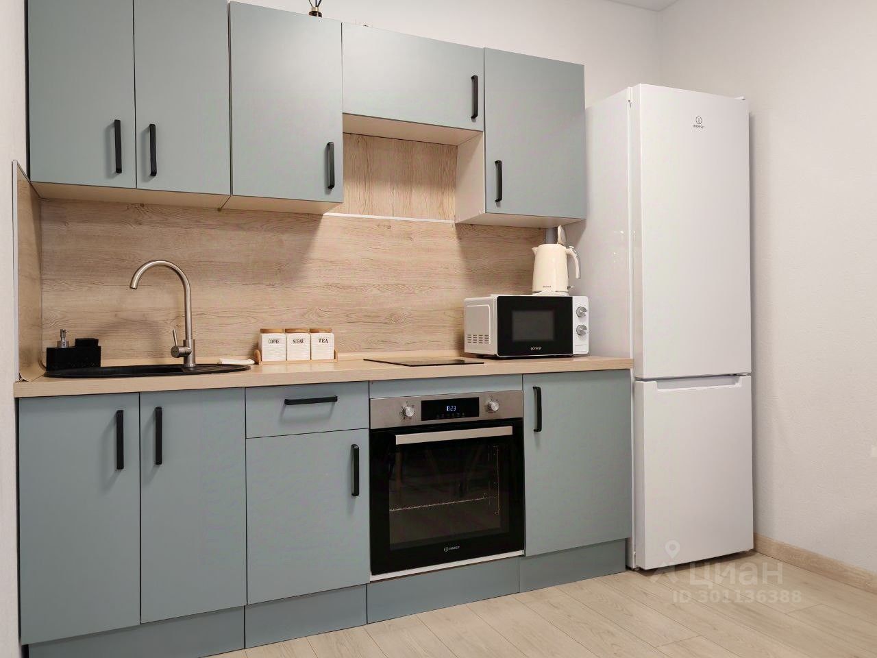 Кухонные принадлежности, чайник, стиральная машина, микроволновка, духовой шкаф.